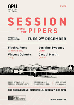Na Píobairí Uilleann are delighted to present ‘Session with the Pipers’ in The Cobblestone on Tuesday 2nd December at 9:30pm, doors open at 9pm. This month’s line-up features: