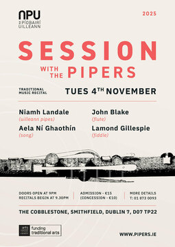 Na Píobairí Uilleann are delighted to present ‘Session with the Pipers’ in The Cobblestone on Tuesday 4th November at 9:30pm, doors open at 9pm. This month’s line-up features: